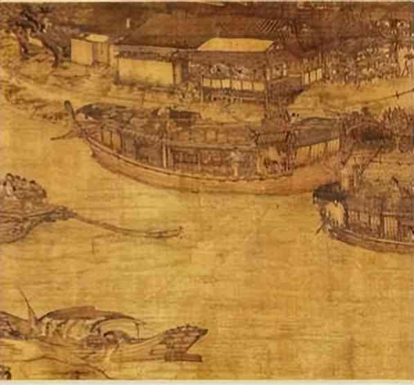 中段,繁忙的汴河码头,人烟稠密,粮船云集。人们有在茶馆休息的,有看相算命的,有在饭铺进餐的。河里船只来往,首尾相接,或纤夫牵拉、或船夫摇橹,有的满载货物逆流而上,有的靠岸停泊紧