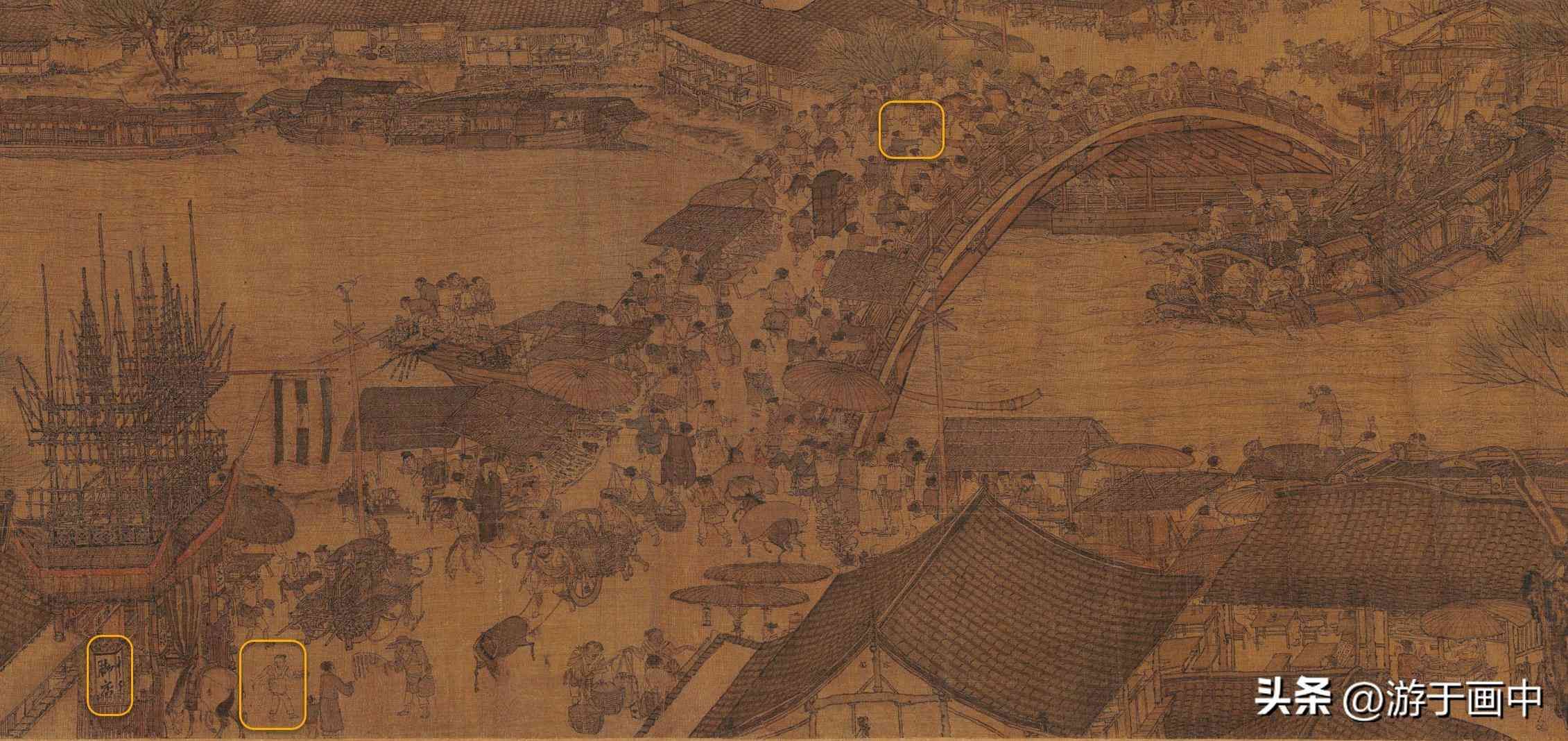 桥下货船马上要过虹桥了,船员却乱作一团,显然是没有提前放倒桅杆,船到桥头还没直,能不急吗?一些船员慌了,拼命地降桅杆,一些船员则死命地撑船妄图调整船体姿态。甚至有个老哥急中生智,用杆顶住桥梁底部,希冀减缓船速。桥上岸边也有不少吃瓜群众在一旁呐喊提醒。
