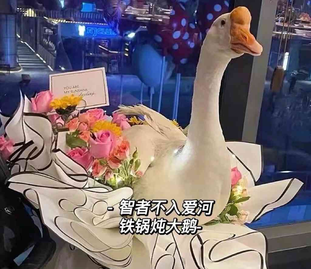 寓意:“智者不入爱河 铁锅炖大鹅”