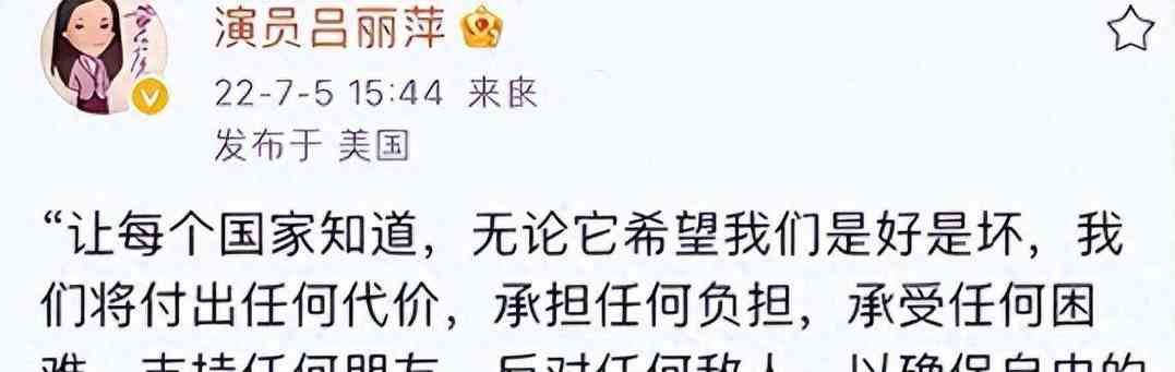 2022年7月4日,吕丽萍在社交媒体上发布了庆祝美国独立日的动态,称美国为"祖国"。这一举动立即引发了网友的强烈不满。