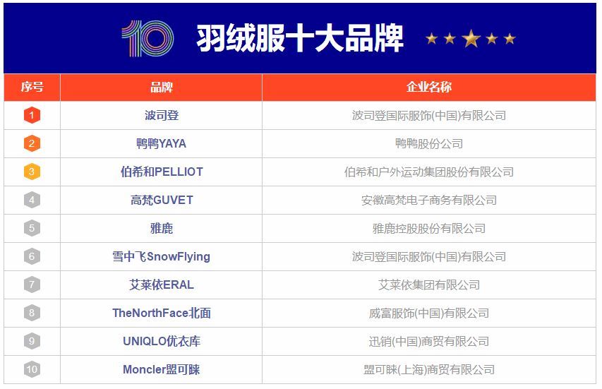 寒潮来袭,棉服已经不能满足我们的保暖需要了,不少人都开始拿出了压箱底的羽绒服。羽绒服是冬季必备服装之一,它的填充物是鸭绒或鹅绒,具有出色的保暖效果。那么羽绒服什么牌子好?下面,小编为大家分享羽绒服十大品牌排行榜,包括波司登、鸭鸭YAYA、伯希和PELLIOT、高梵GUVET、雅鹿、雪中飞SnowFlying、艾莱依ERAL、TheNorthFace北面、UNIQLO优衣库、Moncler盟可睐等。该榜单由CNPP品牌榜中榜大数据研究院和CN10排排榜技术研究院专业测评而得出,一起来了解下吧。
