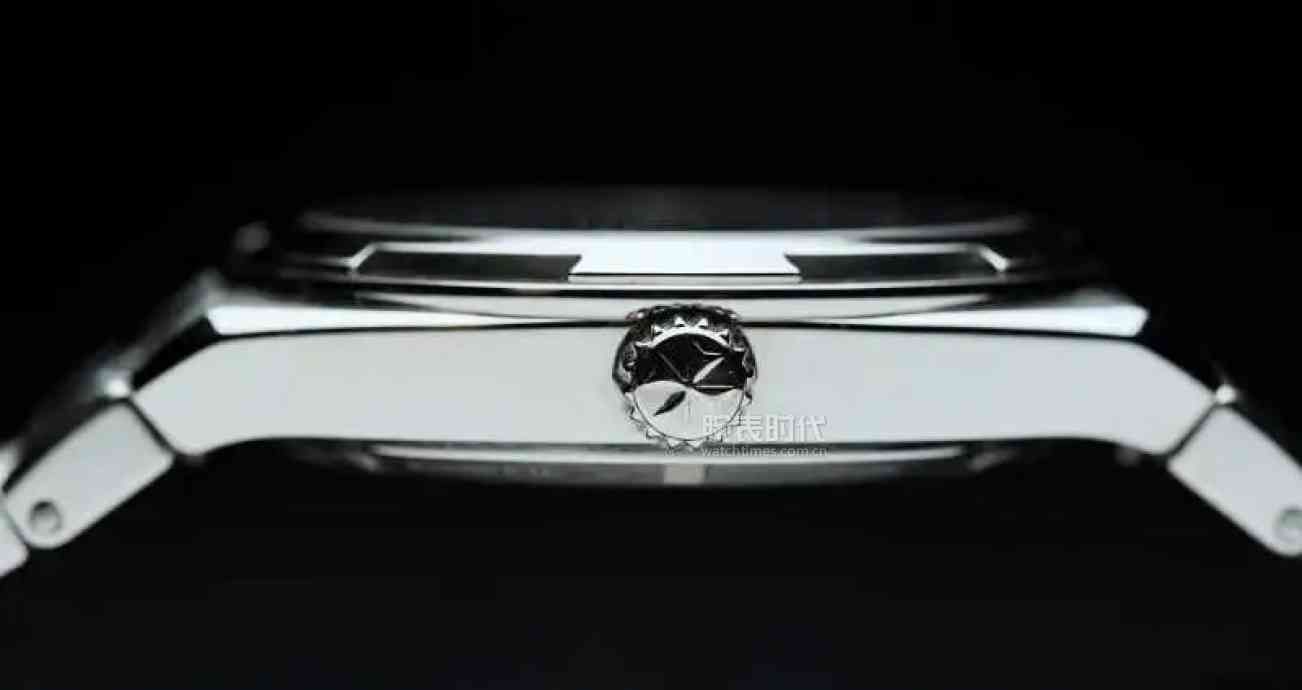 表身的设计也是相当的出彩,有着和表带一样上乘的打磨工艺。表把设计很大,是旋入式的,操作起来握感很好,而且被打磨得相当圆滑,完全没有疙手背的感觉。从侧面看去,表耳是向下微弯的设计。所以虽然是一体化设计的大表耳,但是相当贴手,完全没有挺起来顶住袖口的问题。
