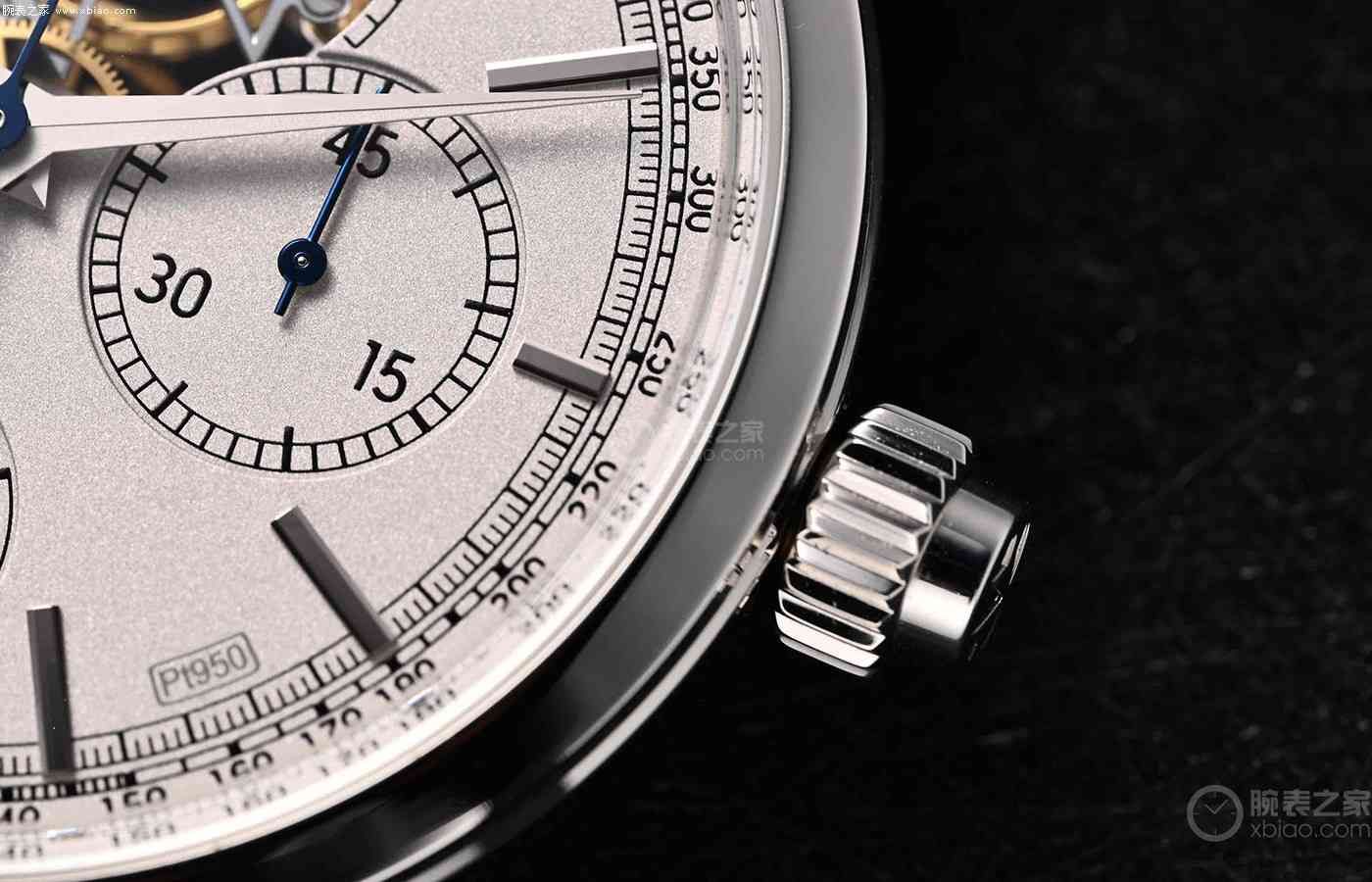 江诗丹顿限量铂金珍藏系列囊括了品牌多款限量臻品杰作,此次选择了2020年问世的Traditionnelle传袭系列陀飞轮计时腕表,新作在功能上延续了前作的陀飞轮与单按钮计时功能两项复杂功能。精细粒纹质感的表盘上,12点位置处设立了醒目鲜明的陀飞轮框架,标志性的马耳他十字架构与左侧品牌标识完美呼应;45分钟计时小表盘和65小时动力储存显示分别设于3点和6点位置,计时盘通过铂金表冠处上的单一按钮进行操作,整体布局清晰明了。简洁的线条勾勒及高效实用的布局设计传达了高奢级正装表的优雅风范。